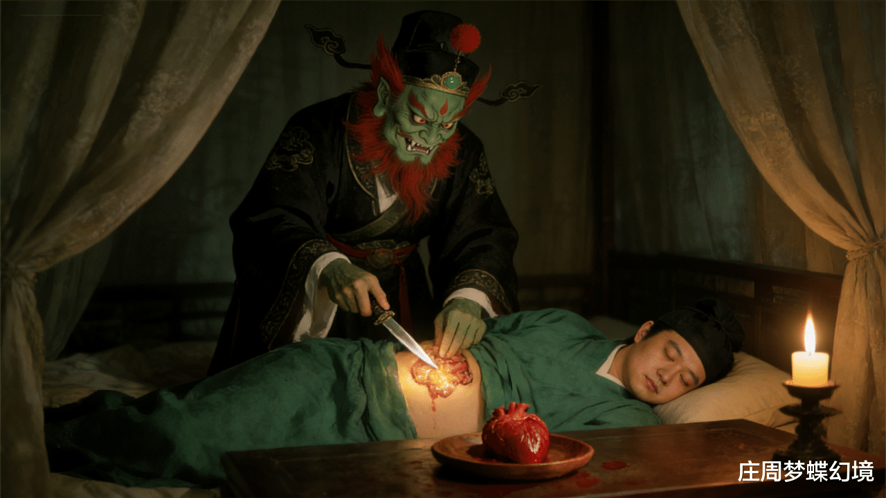 陆判却笑着摆手:“别怕,我只是帮你换颗聪慧的心。”他从容地把整理好的内脏塞回朱尔旦腹中,又将伤口合拢,最后用裹脚布缠紧他的腰。整个过程没有一滴血落在床上,朱尔旦只觉得肚子有些发麻。他瞥见桌上放着一块血肉,陆判解释说:“这是你原来的心。你写文章不快,是因为心窍被堵住了。我在阴间从千万颗心里,挑了颗最好的给你换上,这颗旧的留着凑数。”说罢便起身关上门离开了。