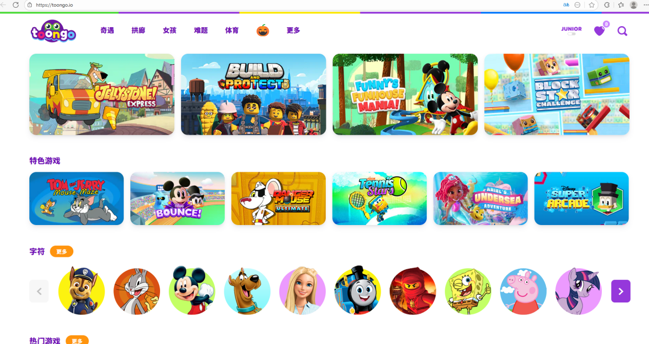 10、http://cartoongames.io这是一个完全免费的在线卡通游戏网站。它集成了非常多的卡通人物系列游戏,例如探险活宝、小猪佩奇、海绵宝宝、忍者神龟、少年泰坦、汪汪队、猫和老鼠等系列,非常全面。此外,还有单独的迪士尼系列版块,点击即可直接开玩,游戏质量也非常不错。
