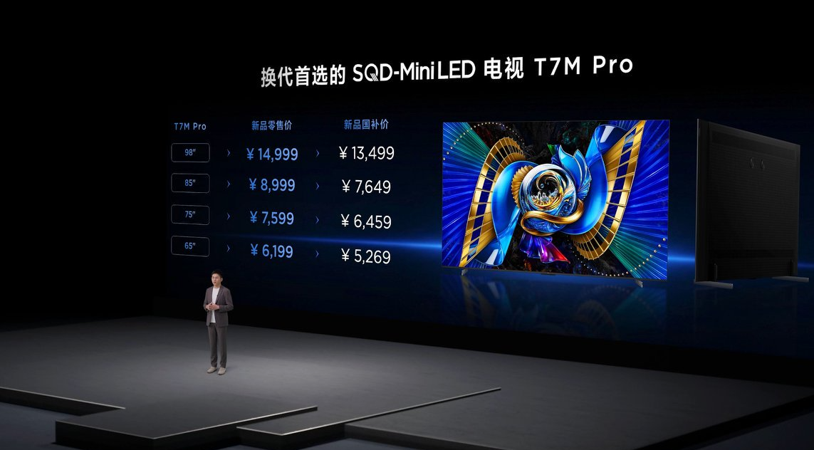 TCL这次的发布会注定是让行业为之震动的。以‘当技术站上巅峰,普惠才有力量’为主题,TCL正式发布了三款搭载SQD-Mini LED技术的新品——Q9M Pro、T7M Ultra、T7M Pro。去年还属于近两万旗舰机皇的技术,如今最低售价仅4K+,让巅峰画质真正走进千家万户。”
