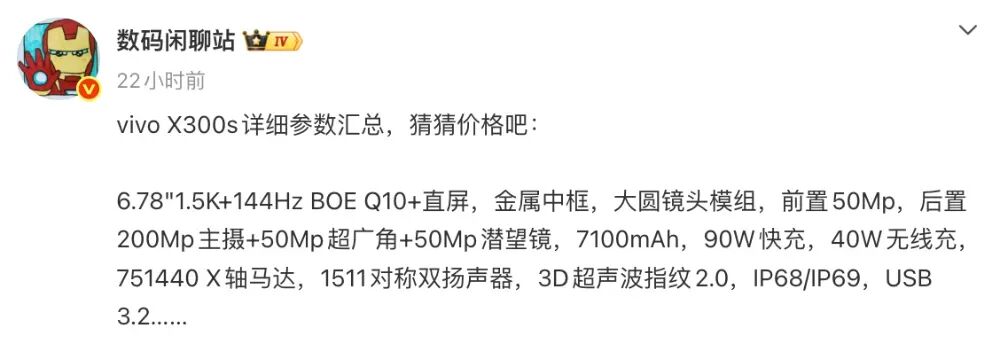 今天,博主@数码闲聊站 的一份消息中提到了vivo X300s的详细参数信息。