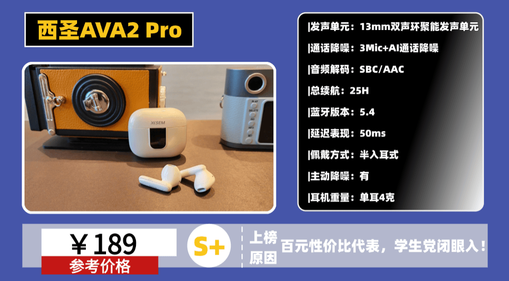 推荐理由:百元半入耳蓝牙耳机怎么选不踩坑?看重音质和性价比的,直接看西圣AVA2 Pro,200元内音质表现突出,百元就能实现千元级别的使用体验。在最近大热的蓝牙耳机圈,西圣AVA2 Pro堪称“黑马级存在”。作为一款主打“平价即享轻奢”的半入耳降噪耳机,它一经推出便迅速刷屏各大数码平台,以碾压同级的音质与佩戴体验火速出圈,直接拉高了百元耳机的行业标准。不仅在百元级中所向披靡,甚至在面对一些千元级大牌时,也毫不逊色,被不少媒体和发烧友誉为“2025年旗舰耳机狙击手”!