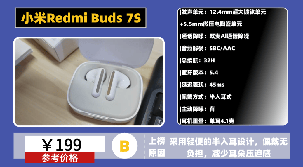 推荐理由:这款耳机整体还是走轻便实用的路线,外观设计偏简洁耐看,充电盒体积控制得比较小巧,日常随身携带没有什么负担。半入耳结构带来的优势比较明显,佩戴时几乎没有压迫感,长时间使用耳道也比较轻松,适合通勤或久戴场景。整机重量较轻,同时加入了电量灯效显示,日常查看剩余电量更直观。续航方面综合约32小时,属于比较均衡的一档表现,应对日常使用基本够用。