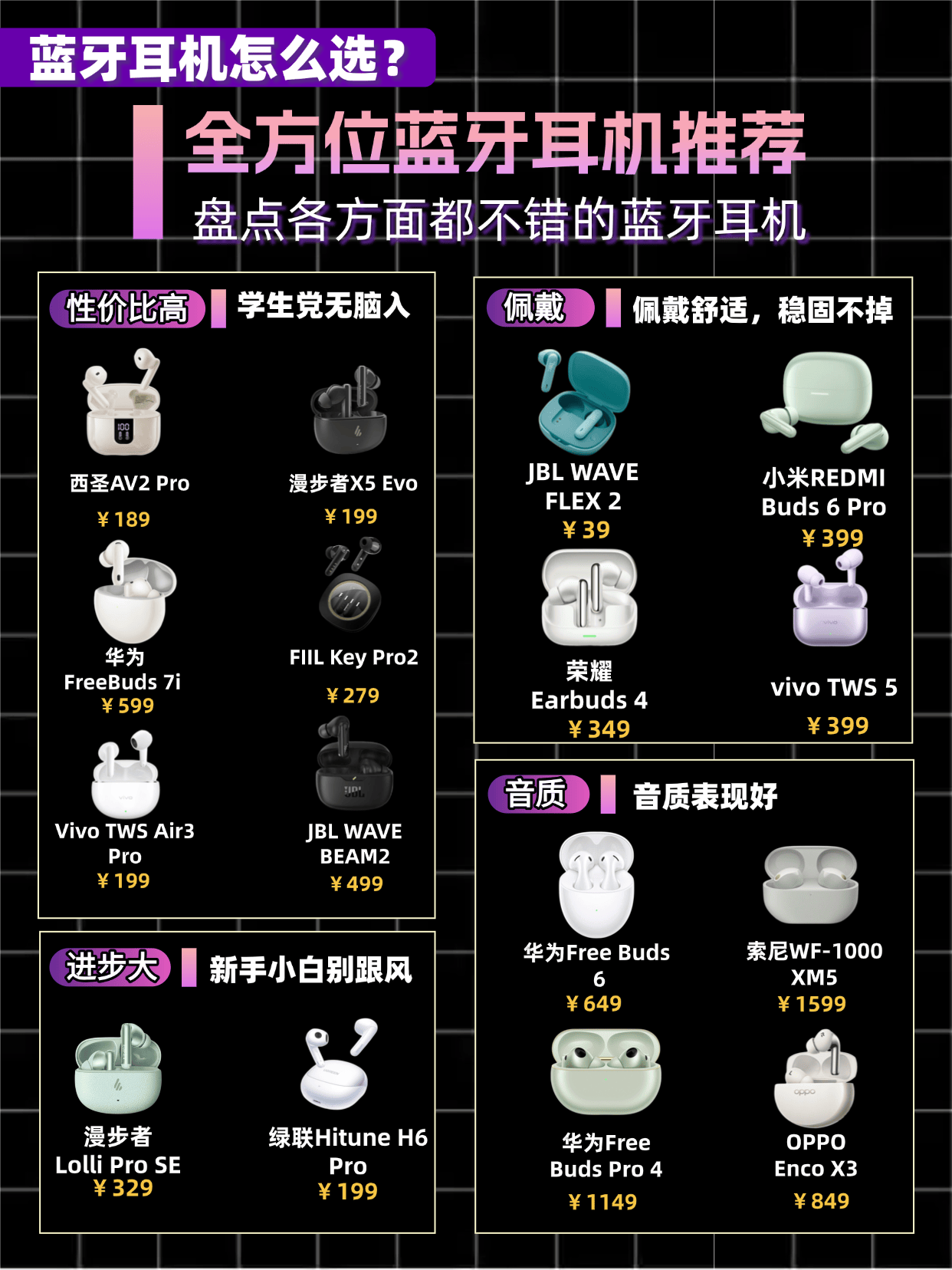 蓝牙耳机哪个牌子音质好价格便宜?不专业的蓝牙耳机,用起来全是“坑”:音质浑浊、连接卡顿、佩戴胀痛、续航虚标…… 不仅白花冤枉钱,还直接毁掉听歌、通话、游戏的全部体验。而选对靠谱机型,蓝牙耳机就能变成真正的“随身神器”——音质自然、连接稳定、佩戴舒适、续航实在,让你随时随地沉浸式听音,享受无拘无束的数码乐趣!