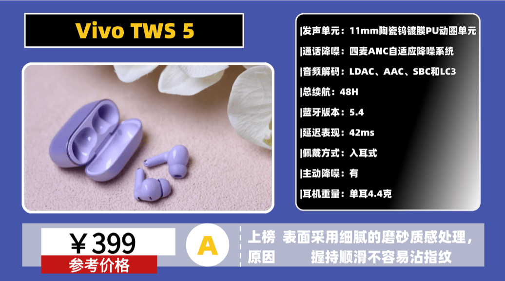 性价比高的蓝牙耳机推荐3、V ivo T WS 5蓝牙耳机