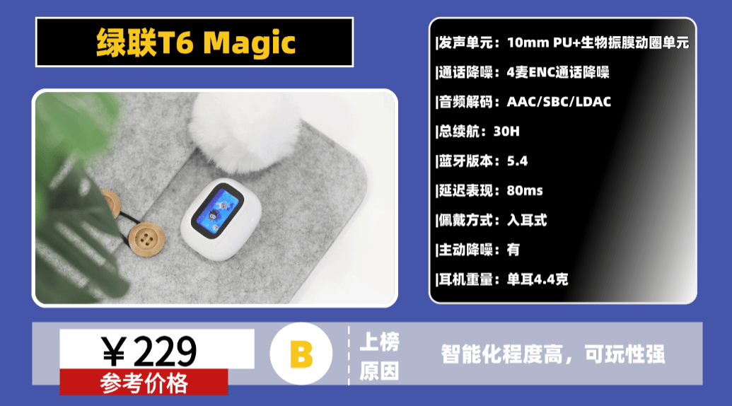 性价比高的蓝牙耳机推荐2、绿 联T 6 Magic蓝牙耳机