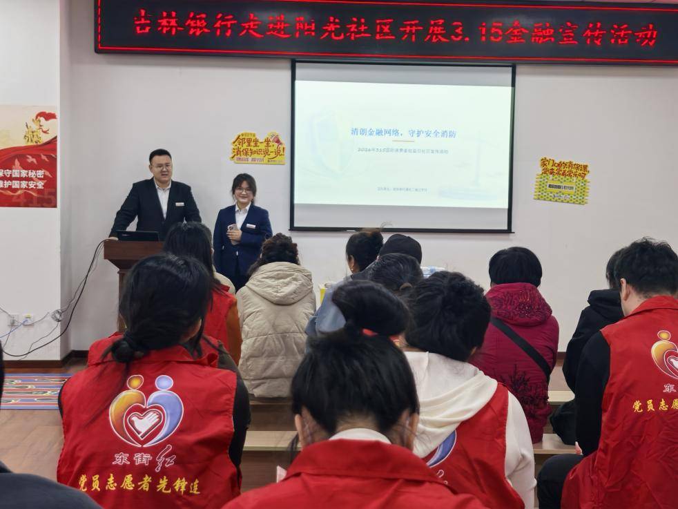 为切实维护金融消费者合法权益,提升社区居民反诈防骗意识与风险识别能力,在“3·15”国际消费者权益日来临之际,吉林银行通化二道江支行组织党员志愿者及业务骨干走进通化市二道江区东通化街道阳光社区,开展“清朗金融网络,守护安全消费”主题金融宣传活动,以接地气、有温度的方式为居民筑牢金融安全防护墙。