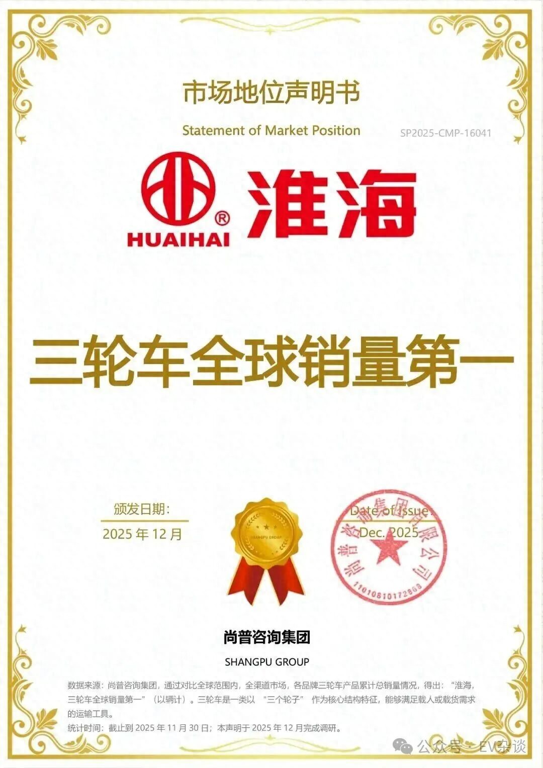 2025年12月份,淮海抢先一步拿出了尚普咨询集团有限公司的认证证书,宣称“三轮车全球销量第一”。