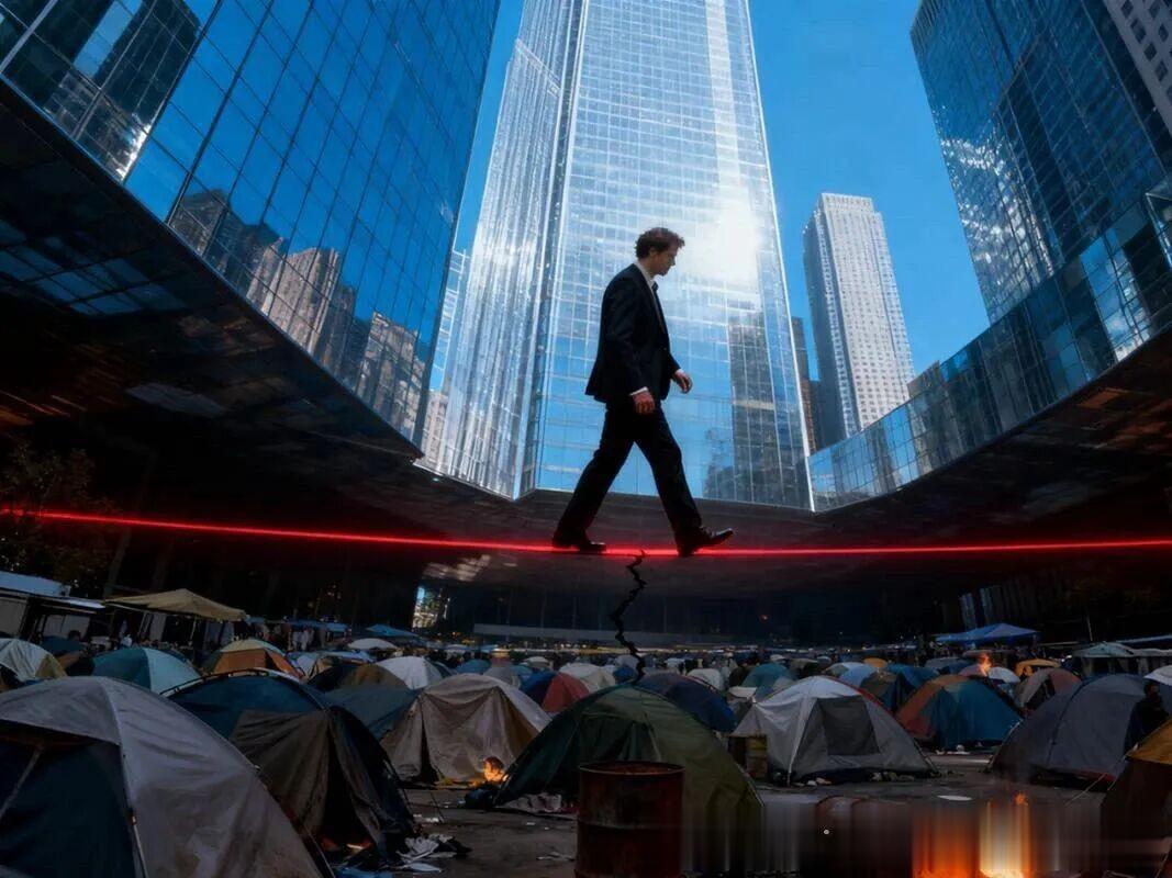 更重要的是,这两幅场景并非平行并列,而是一上一下:中产阶级的场景在上,流落街头的场景在下。每个“中产阶级”都在重力作用下,有自动堕入斩杀线之下的趋势,必须努力抓住点什么,才能不掉下去。
