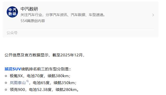续航实在不实在,直接决定日常通勤省不省心。根据中汽数研发布的2025年插混和增程车型纯电续航排行榜,极氪9X凭借70度大电池和380公里的CLTC纯电续航里程,强势登顶插混SUV榜首。