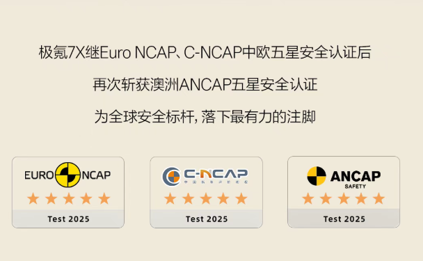 续航要实在,安全更是底线。极氪的“公路坦氪”之名,从来不是一句口号。以极氪7X为例,其搭载的金箍棒穹甲车身安全结构,采用2000MPa超长一体成型热气胀钢柱;十宫格电池防撞结构能承受高达约75吨的侧柱碰瞬间冲击;行业业首发主驾安全破窗器,也让车主在关键时刻多一份从容,也正是因为这些核心安全技术,让极氪7X斩获Euro NCAP、C-NCAP中欧五星安全认证,还获得澳洲ANCAP五星安全认证。