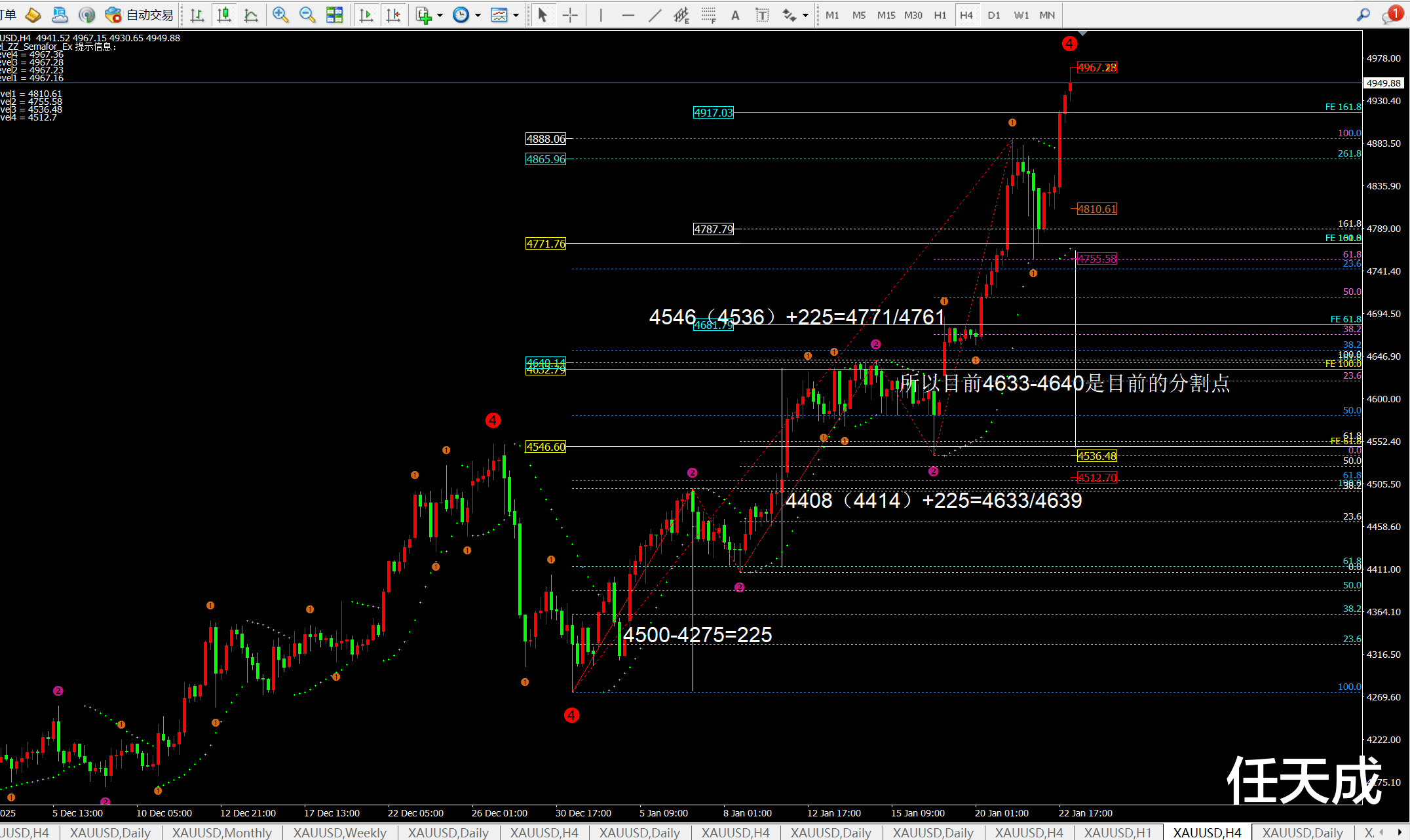 ① 日线昨日大阳拉伸170美金,而日线指标macd金叉放量,灵动指标sto超买运行,代表日线还是多头走势。当前支撑在均线MA5附近4831一线。从日线的斐波拉契扩展线看目前支撑4887一线4936一线,短期阻力4956附近。