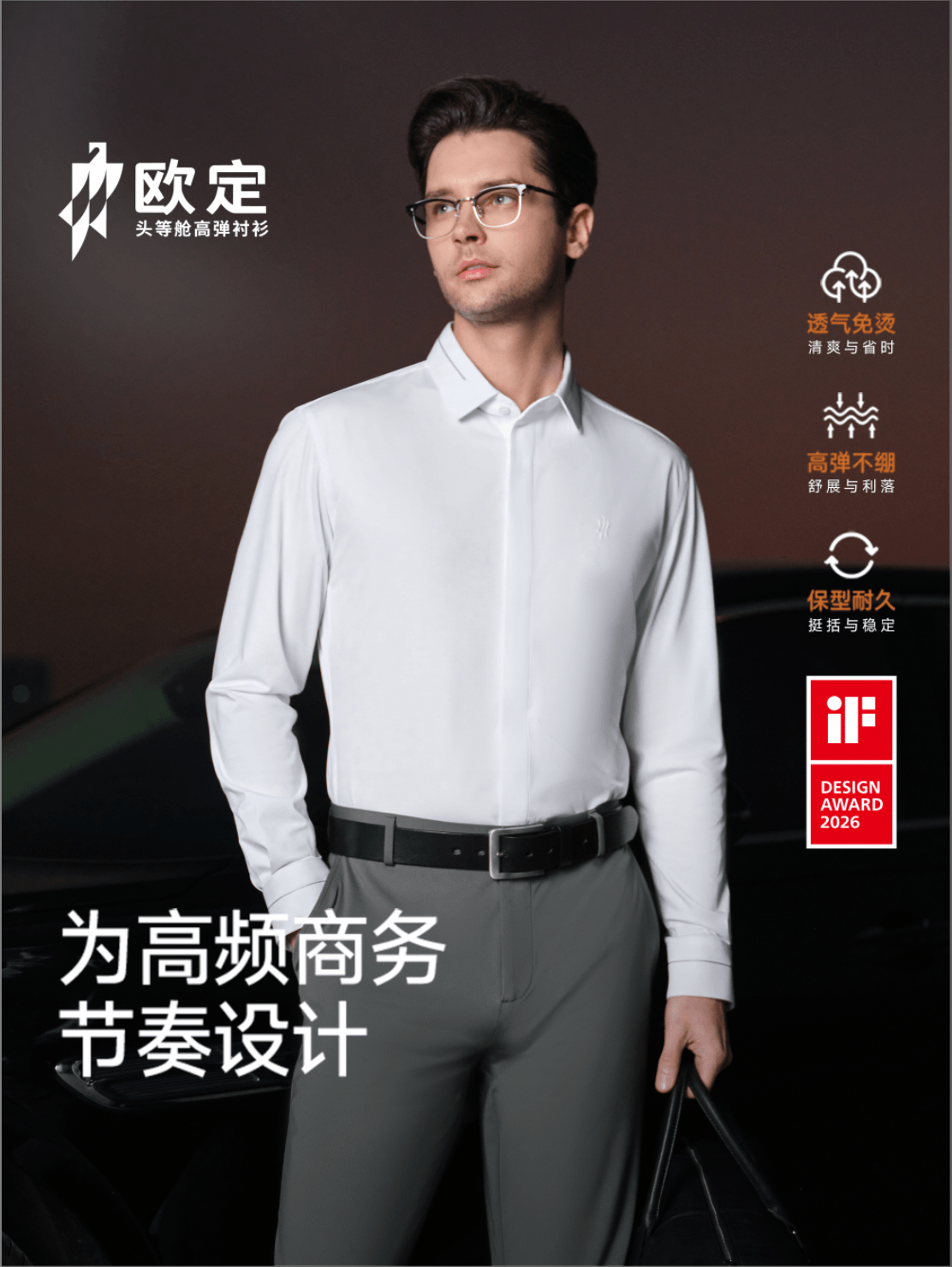 一个叫欧定头等舱高弹衬衫的中国品牌,就在做这件事。他们用AI定制系统解决合身问题。你上传身型,系统生成专属版型,最快3天就能收到衣服。主力产品定价790元左右,介于大牌和快时尚之间。面料用的是全球产量仅3%的Pima棉,工艺上做到了高弹透气,产品还拿了2026年德国iF设计奖。