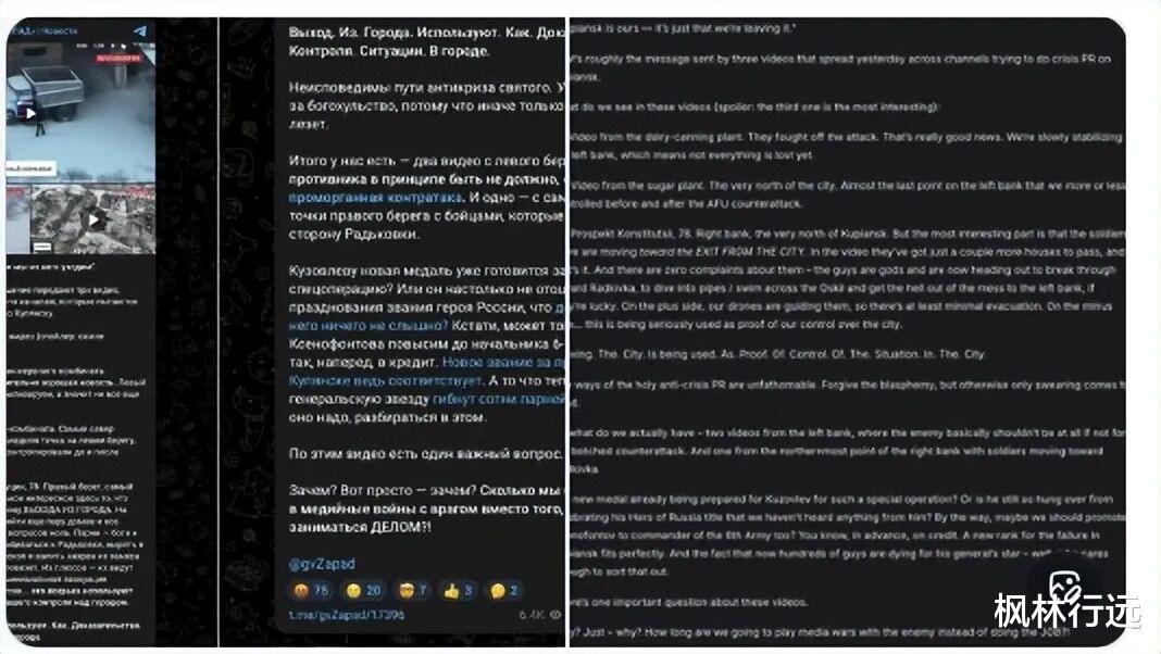 俄罗斯军事博主怒骂国防部弄虚作假,称所谓的“控制库皮扬斯克的证据”竟然是一段三名士兵从奥斯基尔河北岸逃离的视频,俄军目前“只能勉强守住左岸的几株植物。