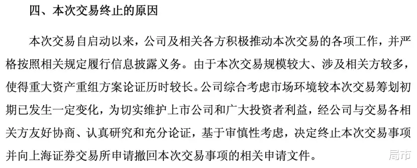 关于重组终止原因,公司表示,由于本次交易规模较大、涉及相关方较多,使得重大资产重组方案论证历时较长。公司综合考虑市场环境已发生一定变化,基于审慎性考虑,决定终止本次交易事项。