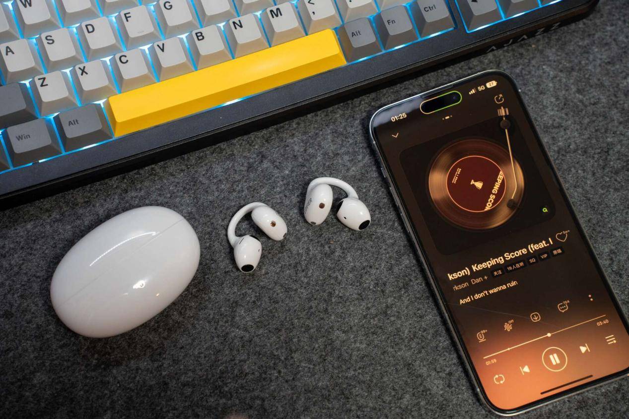 耳夹部分采用多曲率空气弧软梁结构,贴合度不错,日常活动甚至轻度跑跳都能保持稳定。但由于发声单元为半入耳结构,长时间连续佩戴后耳道位置会产生一定压迫感,舒适度更适合分段式使用。