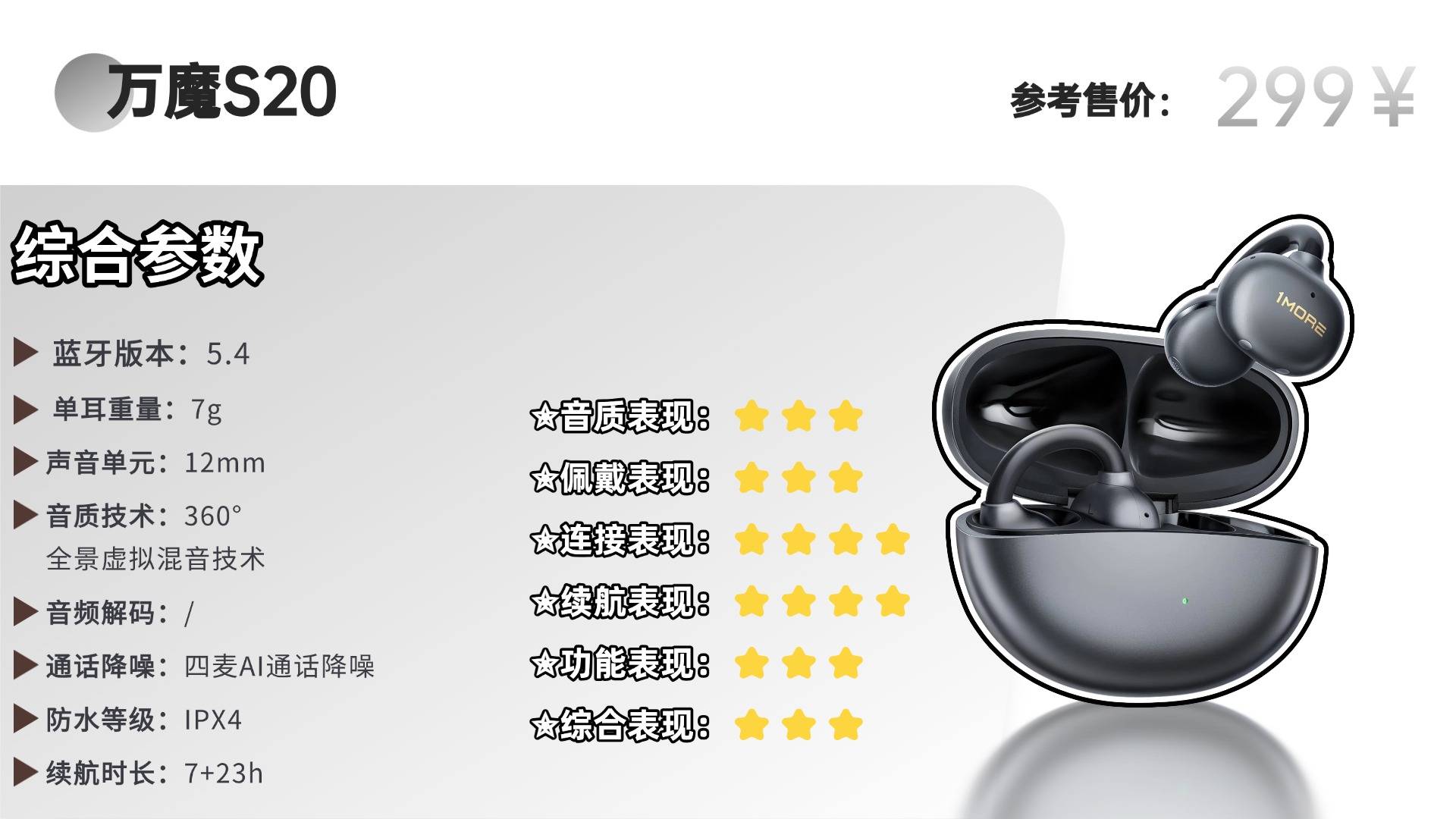 佩戴方面,“空气挂耳技术”带来良好体验。镍钛合金骨架搭配液态亲肤抗菌硅胶,弹性适中且贴合耳型,单耳仅10.3克,久戴无闷热或异物感,对戴眼镜者也同样友好。虽未强调高等级防护,但应对日常出汗或小雨无压力。