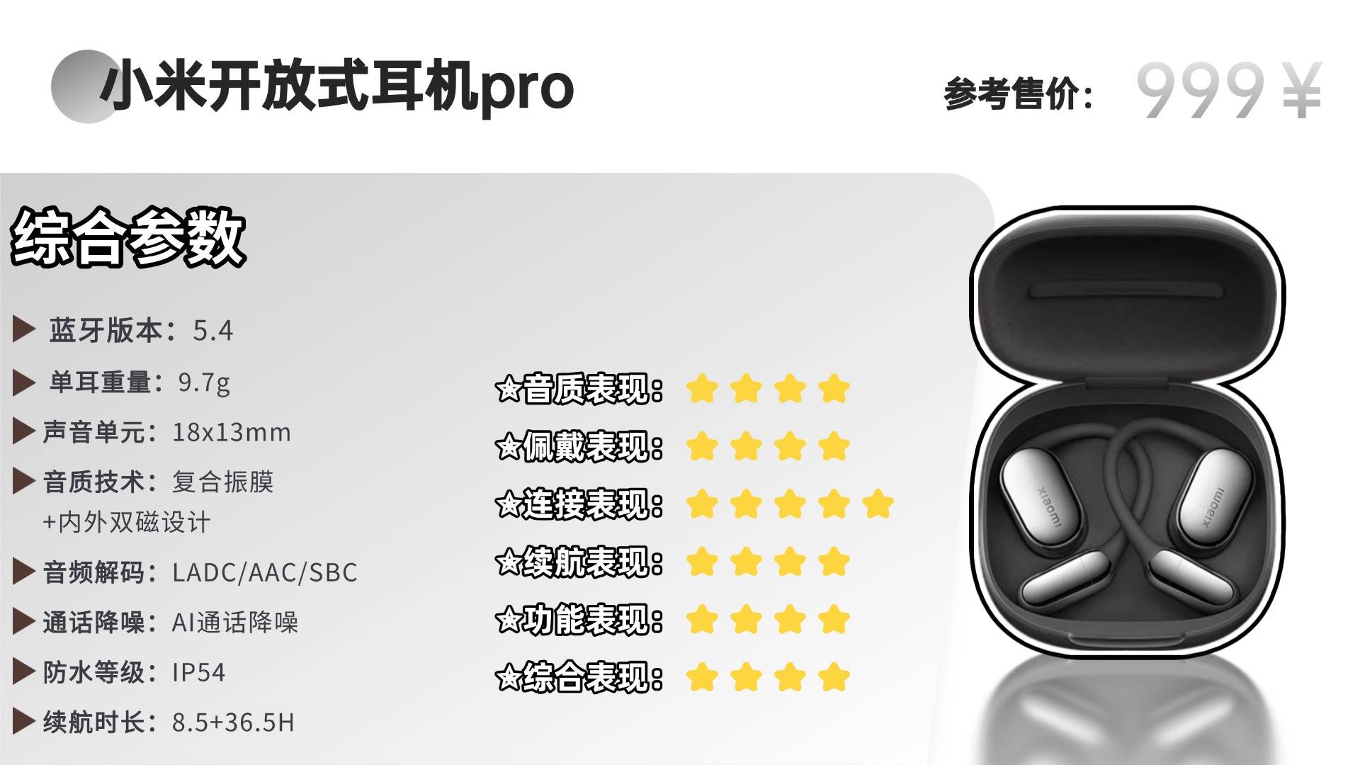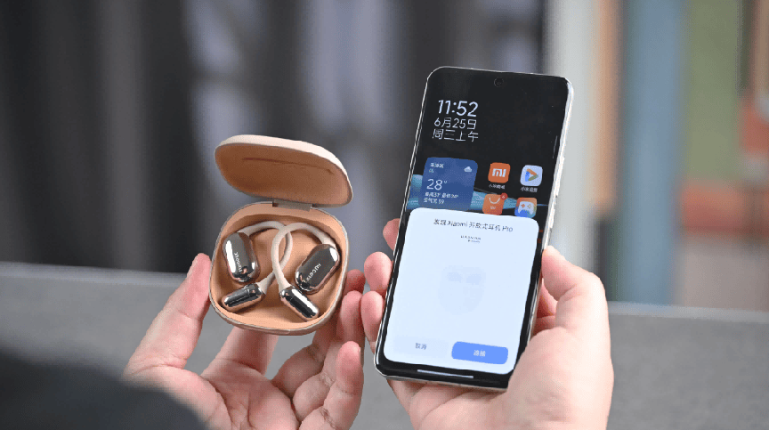 这款小米开放式耳机采用五单元声学架构,包含一枚18×13mm定制大动圈单元、双动铁单元及一枚压电陶瓷高音单元,通过增大振膜面积,实现了饱满的低频表现与细腻的中高频还原,人声与乐器细节清晰自然。该耳机经由哈曼调音并获Hi-Res Audio认证,音质在同价位产品中表现突出。