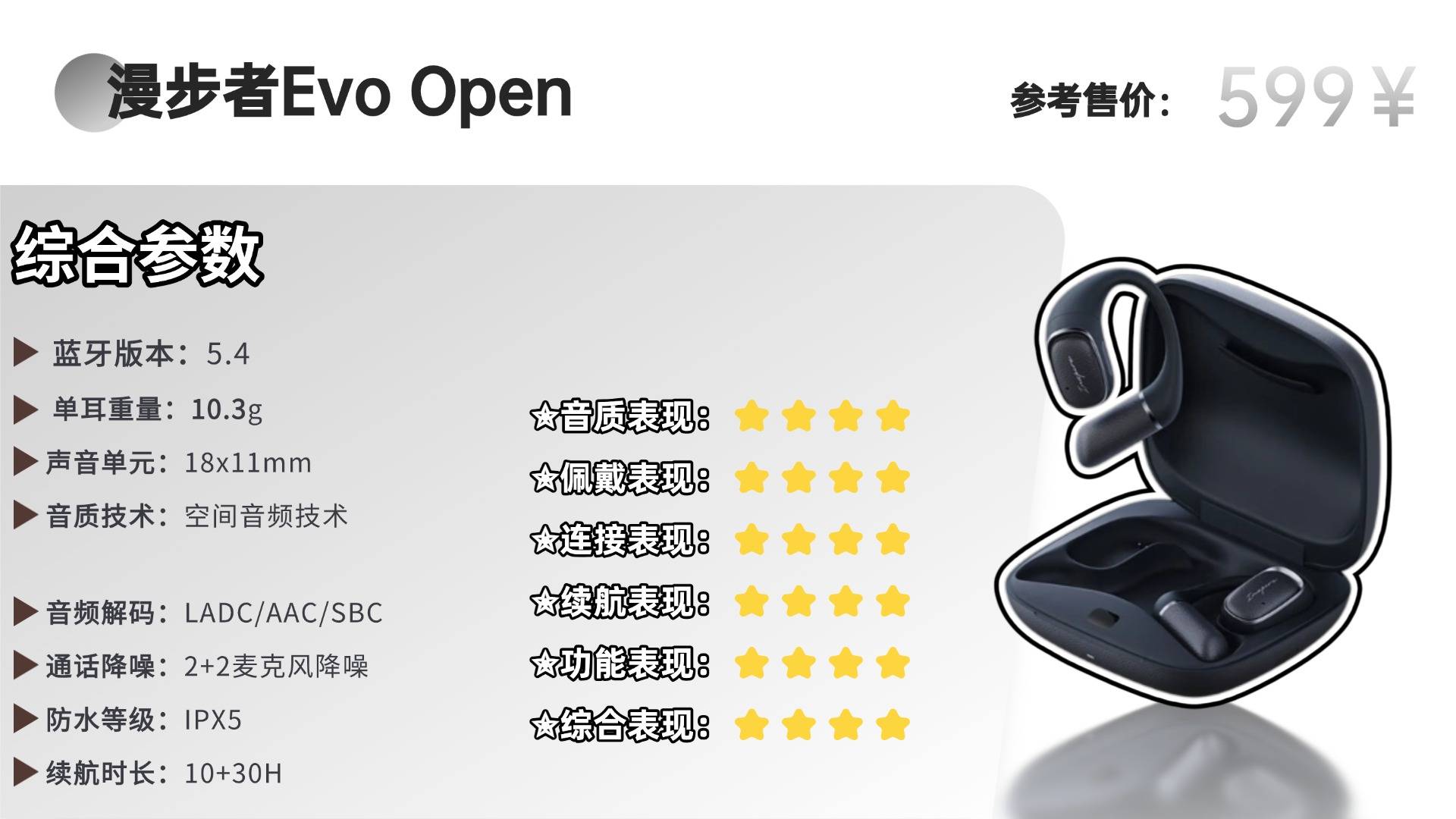 总体来看,Evo Open是一款细节到位、体验优先的开放式耳机,空间音效的加入使其在同级中更具特色,适合注重佩戴舒适与音质均衡的用户。