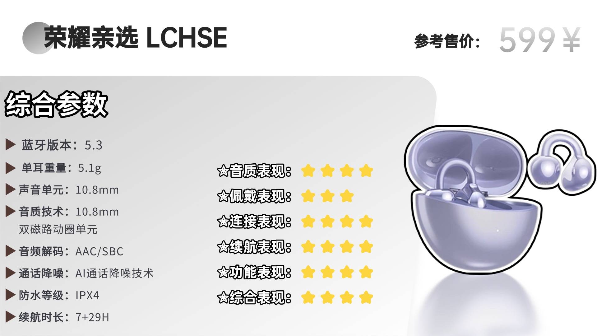 荣耀LCHSE耳机以中式拱桥为设计灵感,融合钛合金与高强PC材质,兼具东方美学与现代科技感。整机采用轻量化处理,单耳重量控制在约5.1克。