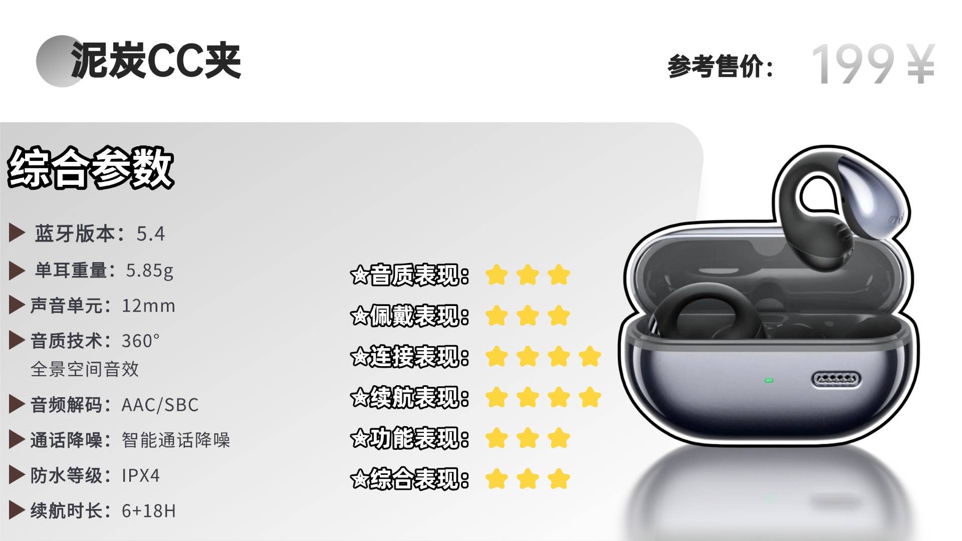 功能配置上,采用蓝牙5.4芯片,连接稳定,支持双设备无缝切换,具备IPX5级防水能力。内置电影、游戏、音乐三种音效模式,实用性较强。续航方面,单次使用约6小时,搭配充电仓总续航为24小时,属于中等水平。总体而言,泥炭CC夹是一款设计简洁的耳夹式耳机,在轻便佩戴与日常音质之间取得了较好平衡,适合短时使用及一般娱乐场景。