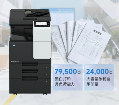 该医疗自助打印方案可广泛兼容柯尼卡美能达多款主流数码复合机,灵活适配各级医院实际应用场景。针对过往打印设备负荷过高、故障频发的核心痛点,方案所配置的柯尼卡美能达A3彩色数码复合机bizhub C226i(以下简称“bizhub C226i”)具备强大的耐用性:月负荷能力高达79,500页(黑白),并标配超大容量碳粉盒(约24,000页),能从容应对峰值打印需求,大幅延长耗材更换周期,从而显著降低医院运维成本。