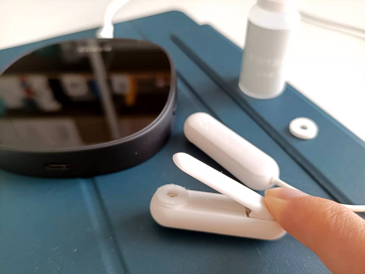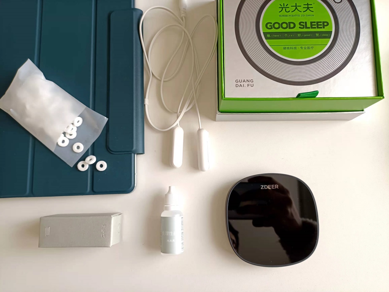 打开包装可以看到左点睡眠仪的主机非常轻薄,屏幕上贴着快速操作指南,此外,垫圈、生理盐水、充电线、耳夹电极线分别装在小盒子中,特别整齐。毕竟大家都是第一次接触CES,所以初次使用睡眠仪的朋友们要认真阅读操作指南,有耐心的还可以认真看看说明书。