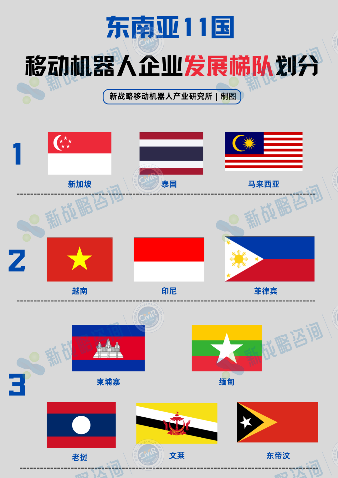 如果用一个词定义东南亚移动机器人的供给格局,“断层”再恰当不过。这里既有新加坡、马来西亚等这样的技术输出高地,也有越南、泰国这类依托制造业崛起的应用热土,更有老挝、文莱等几乎处于市场空白的区域。按照本土移动机器人企业的活跃度与发展势能,东南亚 11 国可被清晰划分为三个梯队。