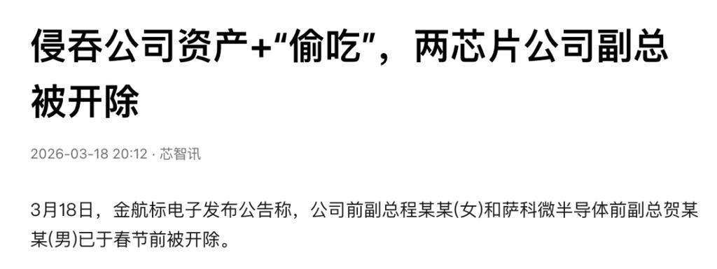 3月18日,深圳金航标电子有限公司一纸公告,直接引爆全网热议!公告称,公司前副总程某某(女)和关联公司萨科微半导体前副总贺某某(男),因“勾结外部侵吞资产”和“在办公室公然偷吃”,已被春节前开除,公司甚至放话要追究他们的刑事责任!这波操作,网友直呼:“职场大瓜,比电视剧还刺激!”