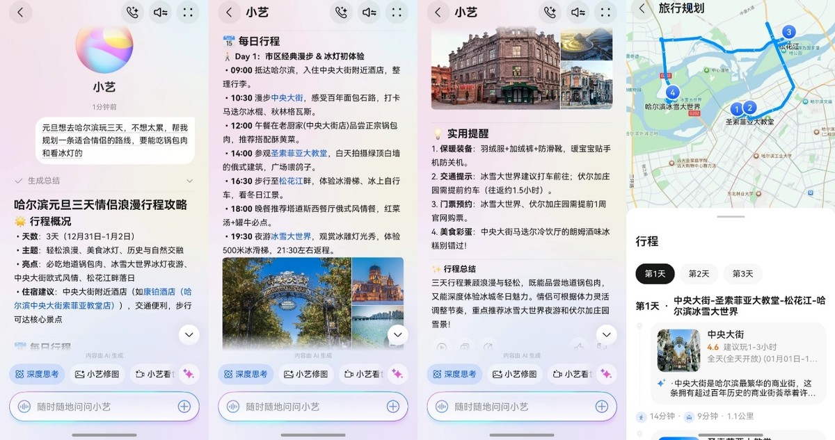 每次出门旅游做攻略,得几个App来回切,看得眼花缭乱。现在只需要简单的一步,直接长按导航条唤醒小艺,说出需求,比如:“元旦想去哈尔滨玩三天,帮我规划一条轻松点的情侣路线,必须要吃到锅包肉、看到冰灯。”
