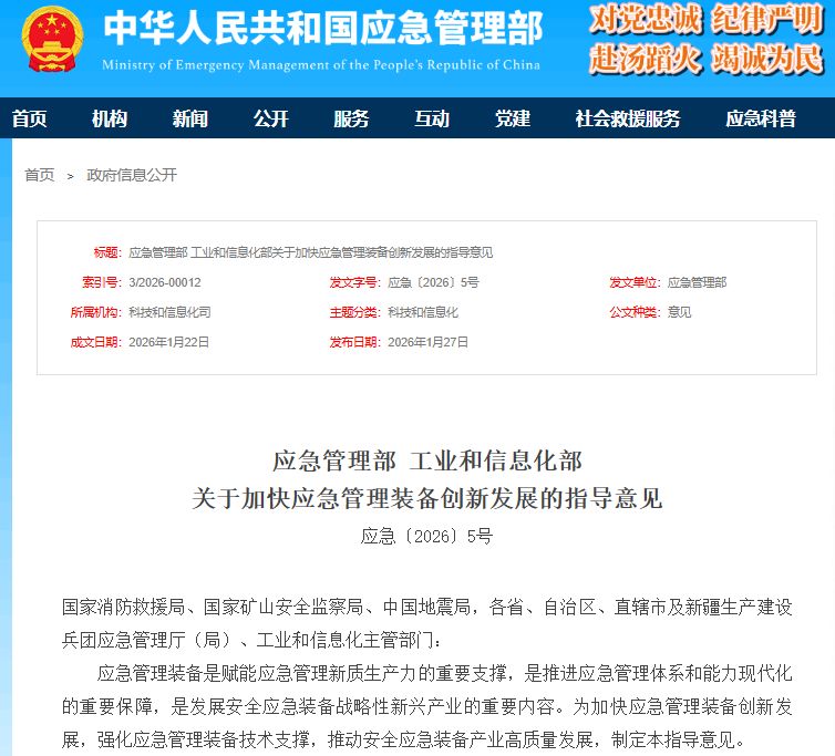 【环球网财经综合报道】资本市场迎来了重磅政策利好。2026年1月27日,应急管理部、工业和信息化部印发《关于加快应急管理