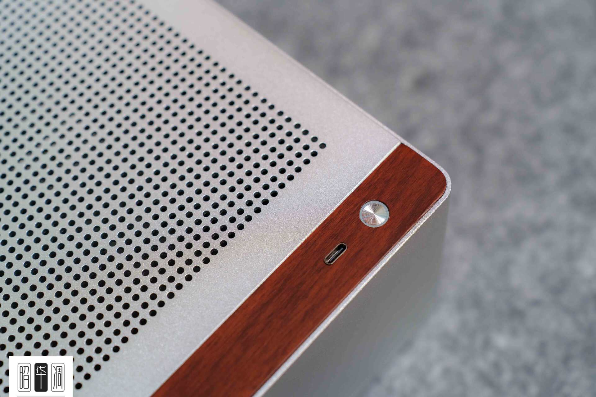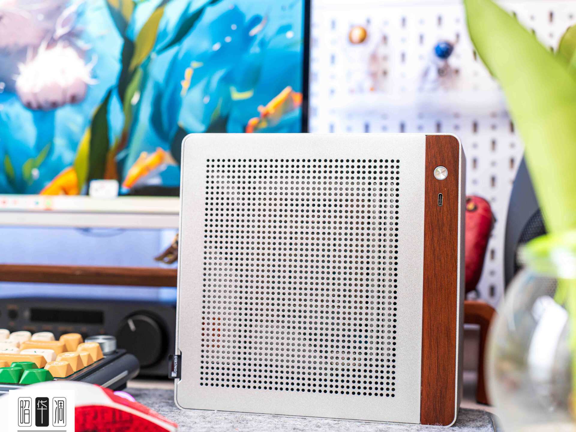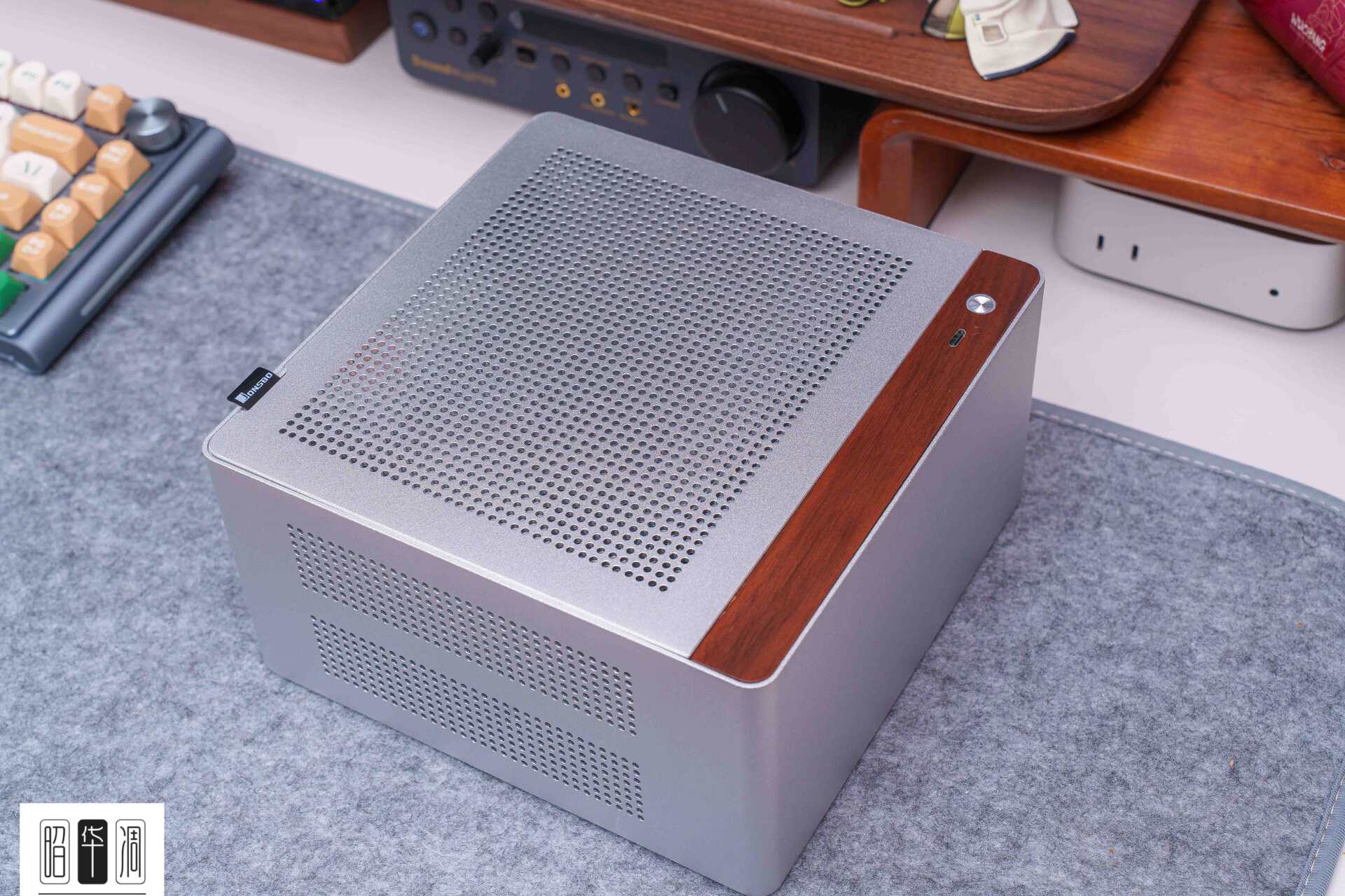 ▼机箱尺寸 205 x 205 x 108mm,体积 4.5L,机箱外壳为铝合金材质,表面做了喷砂工艺,满满的金属质感,辅以侧边北美胡桃木饰条,相当精致。