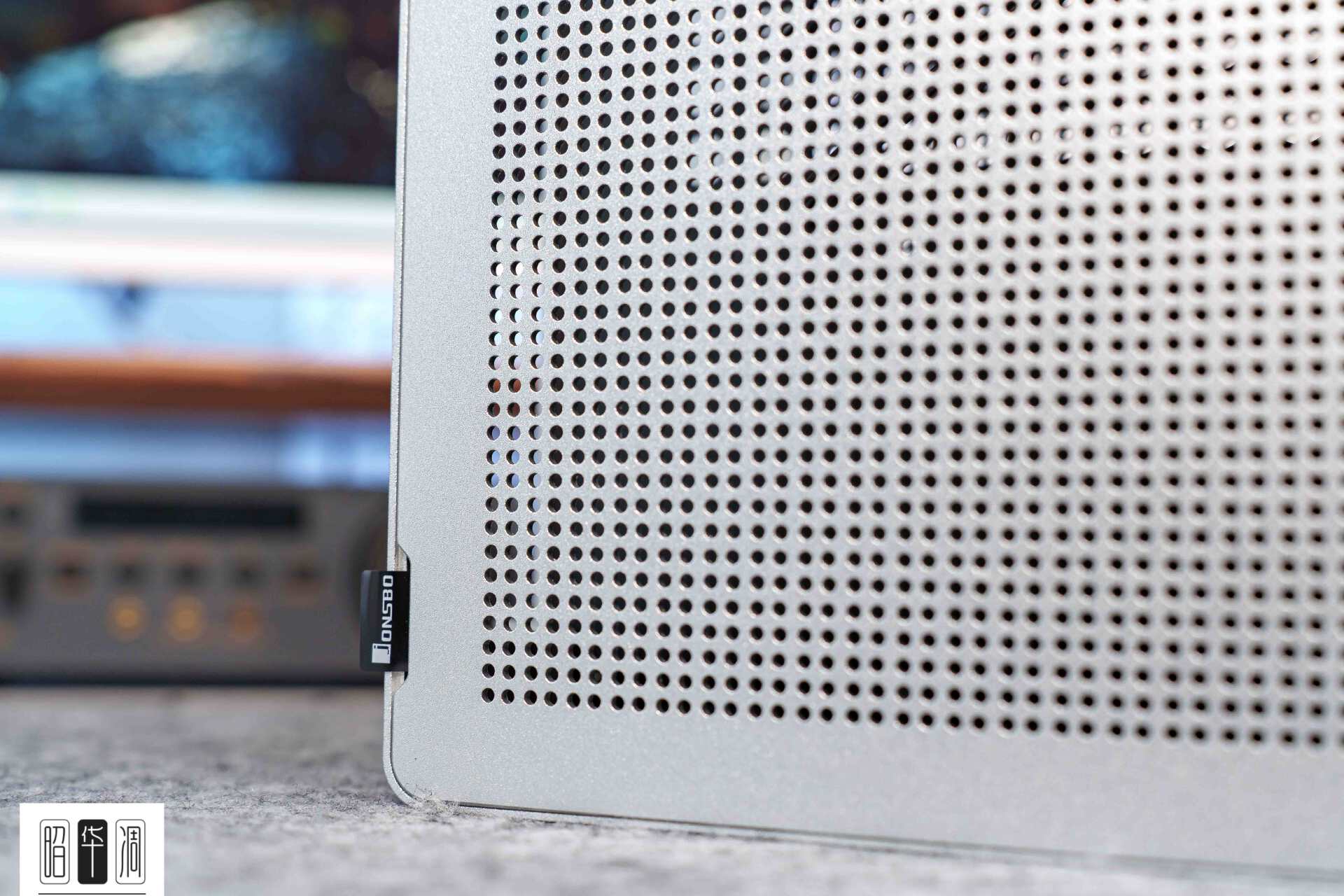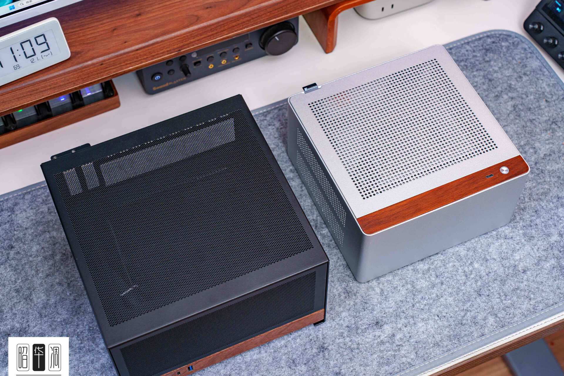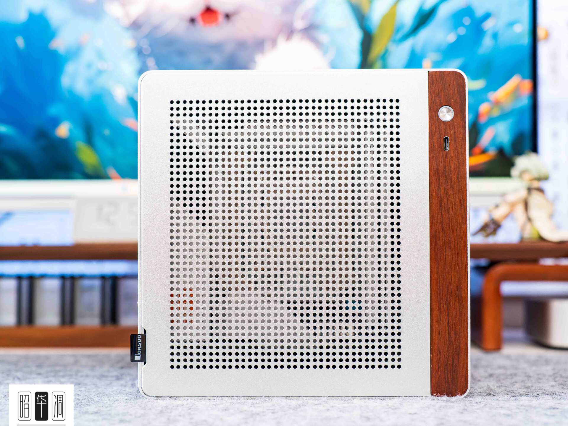▼机箱尺寸 205 x 205 x 108mm,体积 4.5L,机箱外壳为铝合金材质,表面做了喷砂工艺,满满的金属质感,辅以侧边北美胡桃木饰条,相当精致。