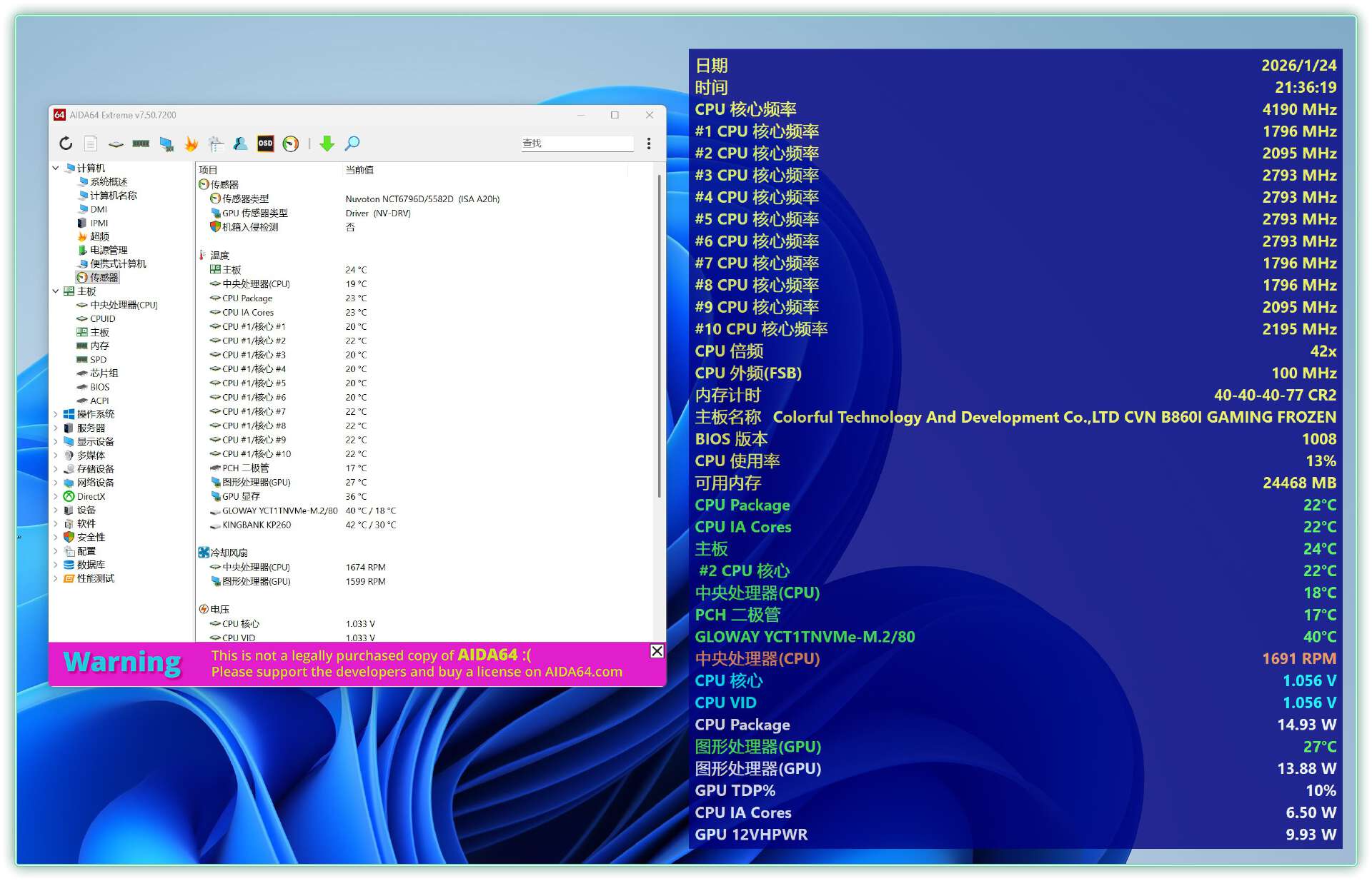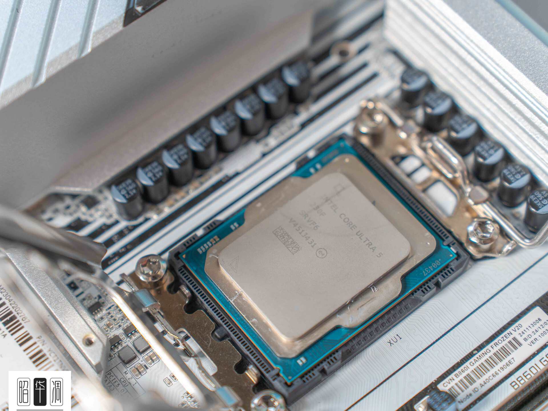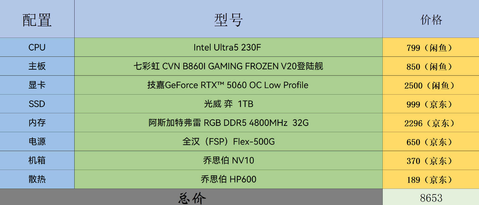 硬件赏析▼硬件基本沿用的上套配置,处理器是酷睿 Ultra5 230F,10 核 10 线程,大核最高 5.0GHz,满载功耗 121W。搭配主板 主板是七彩虹 B860I 登陆艇,两者价格大概 1500 左右,搭配高端显卡也不存在瓶颈。