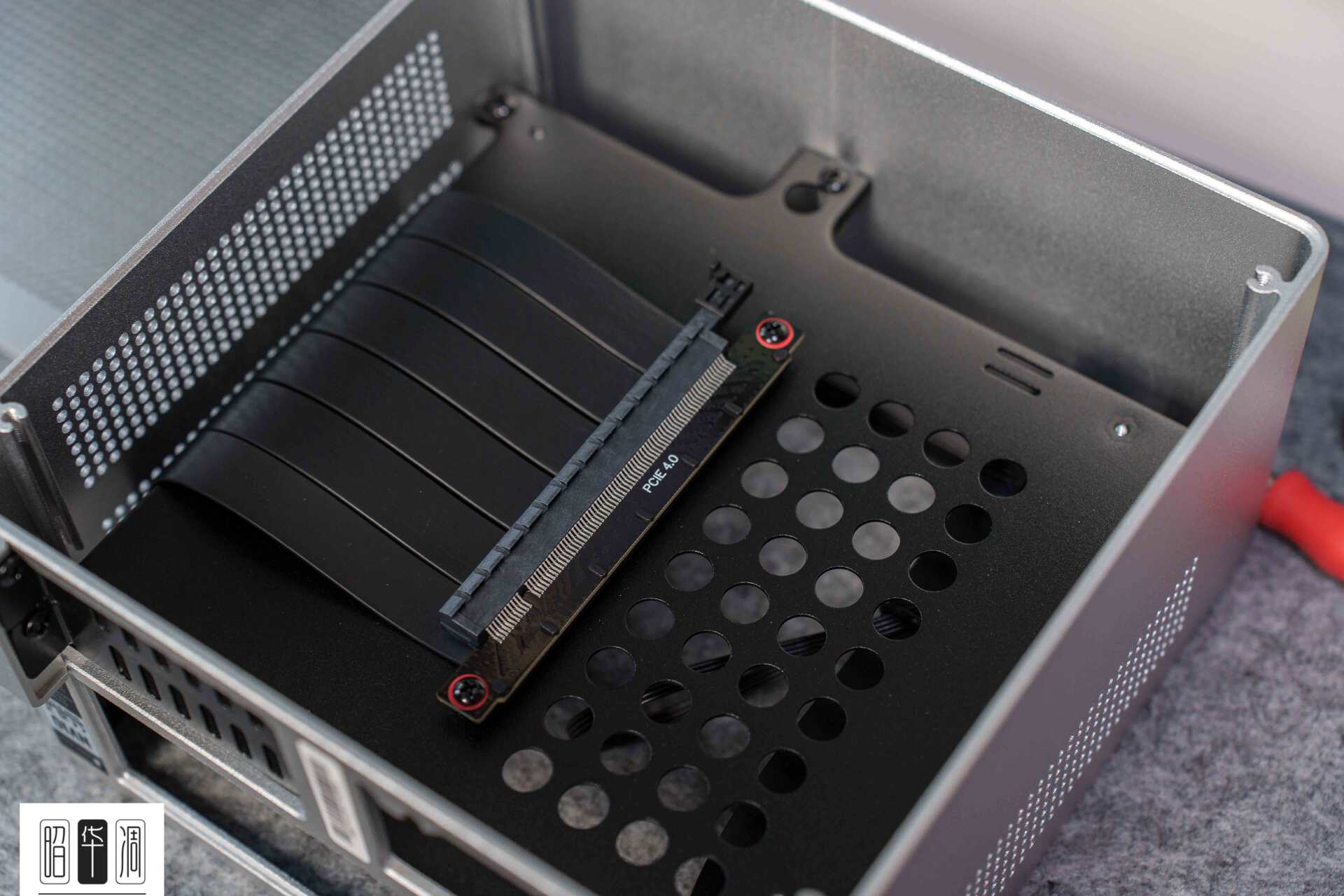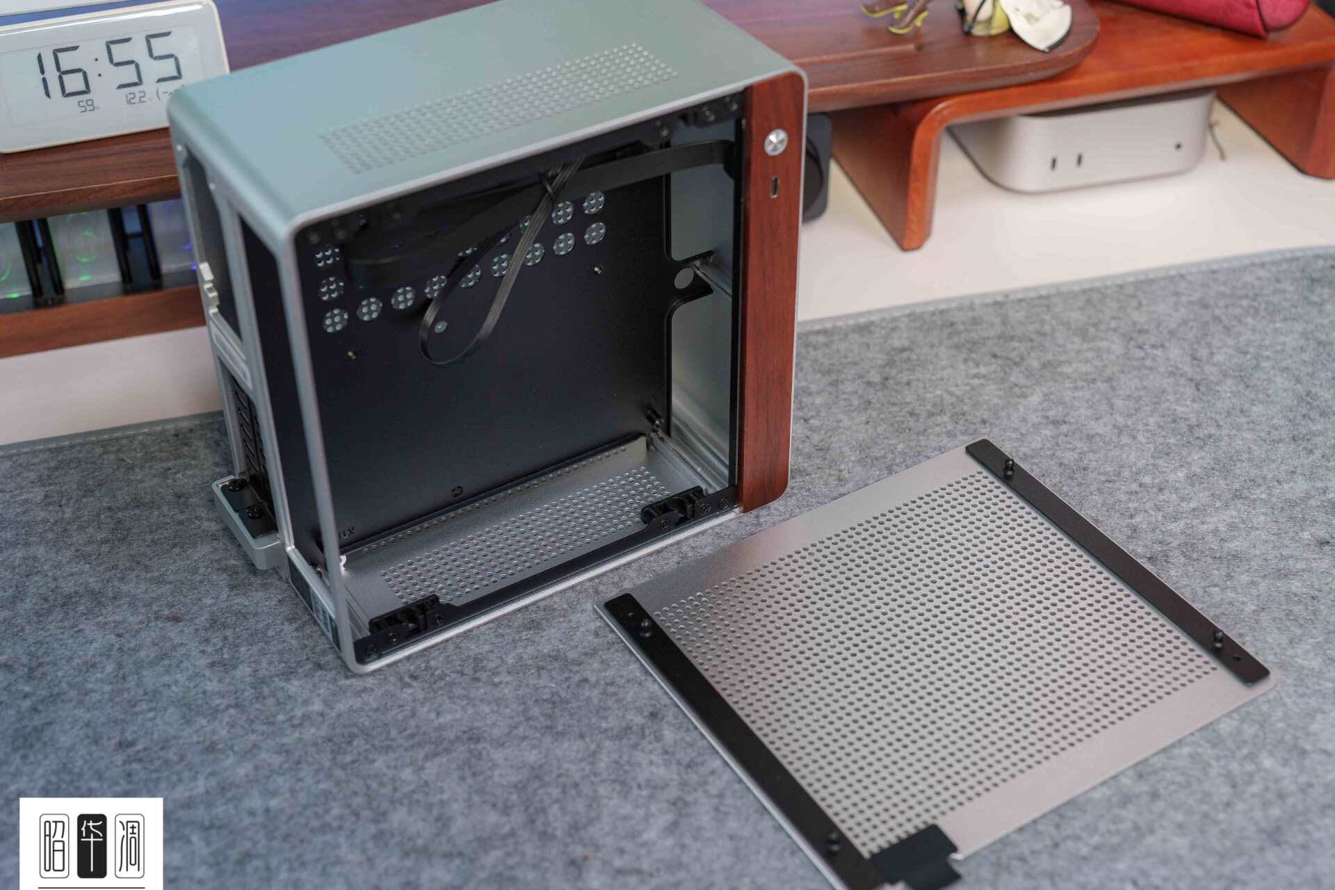 ▼侧板采用的球形卡扣,内部支持标准 ITX 主板的安装,兼容性方面支持 ≤190mm 半高显卡,长度 150mm 以内的 1U Flex 电源和高度 38mm 以内的下压散热器。