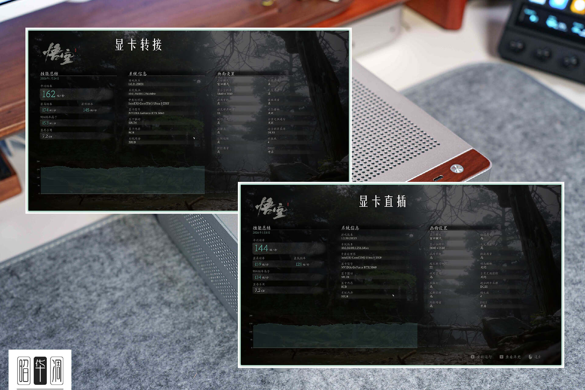 ▼黑神话悟空在 4K 分辨率下开启 DLSS 性能 + 4X 帧生成 + 全局高画质 + 超采样 35 ,帧率达到 162FPS ,居然比显卡直插高了接近 20帧。