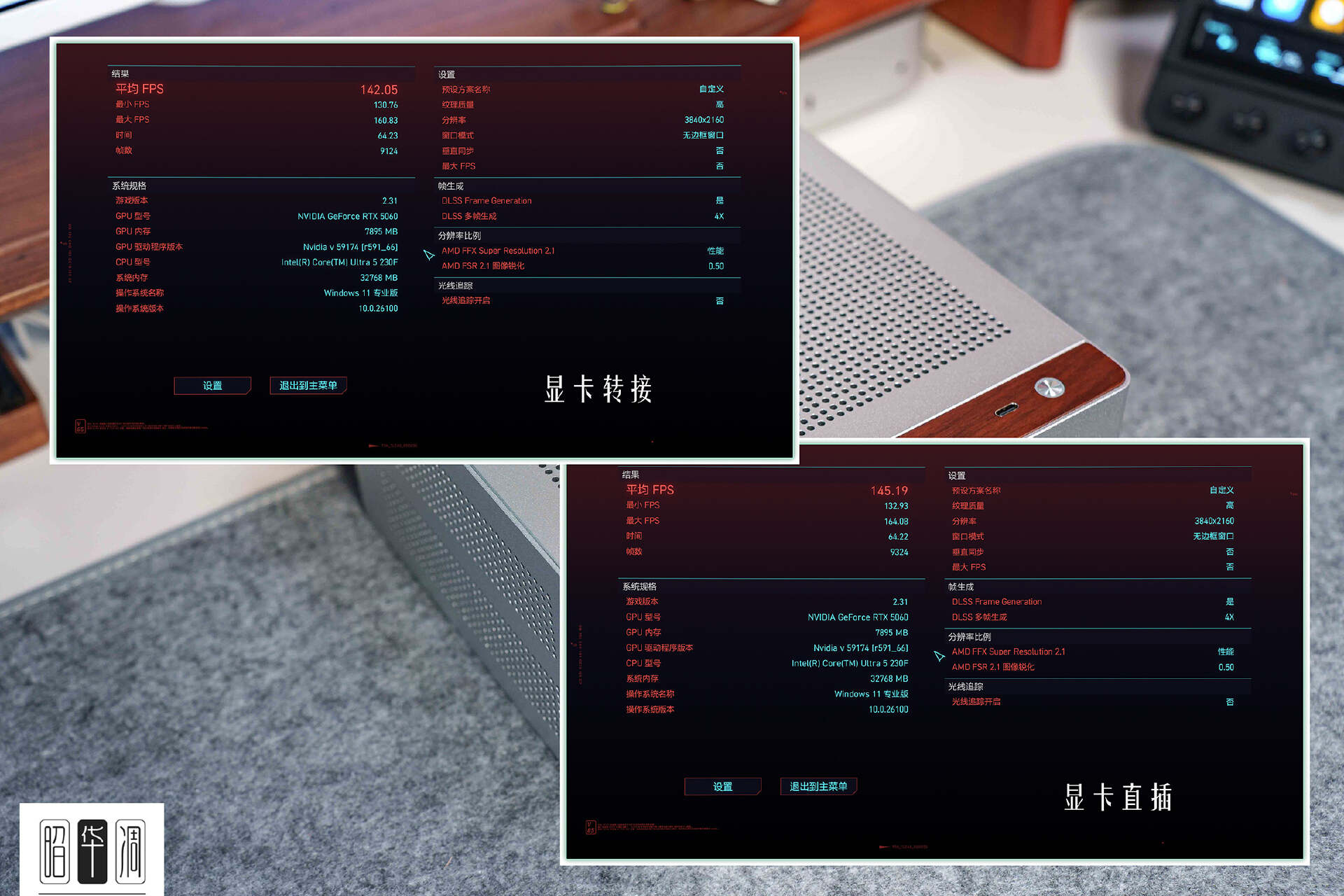 ▼赛博 2077 基于 4K 分辨率 + 超级画质 + 4X 帧生成,平均帧率 142FPS,略低于 E06 的显卡直插