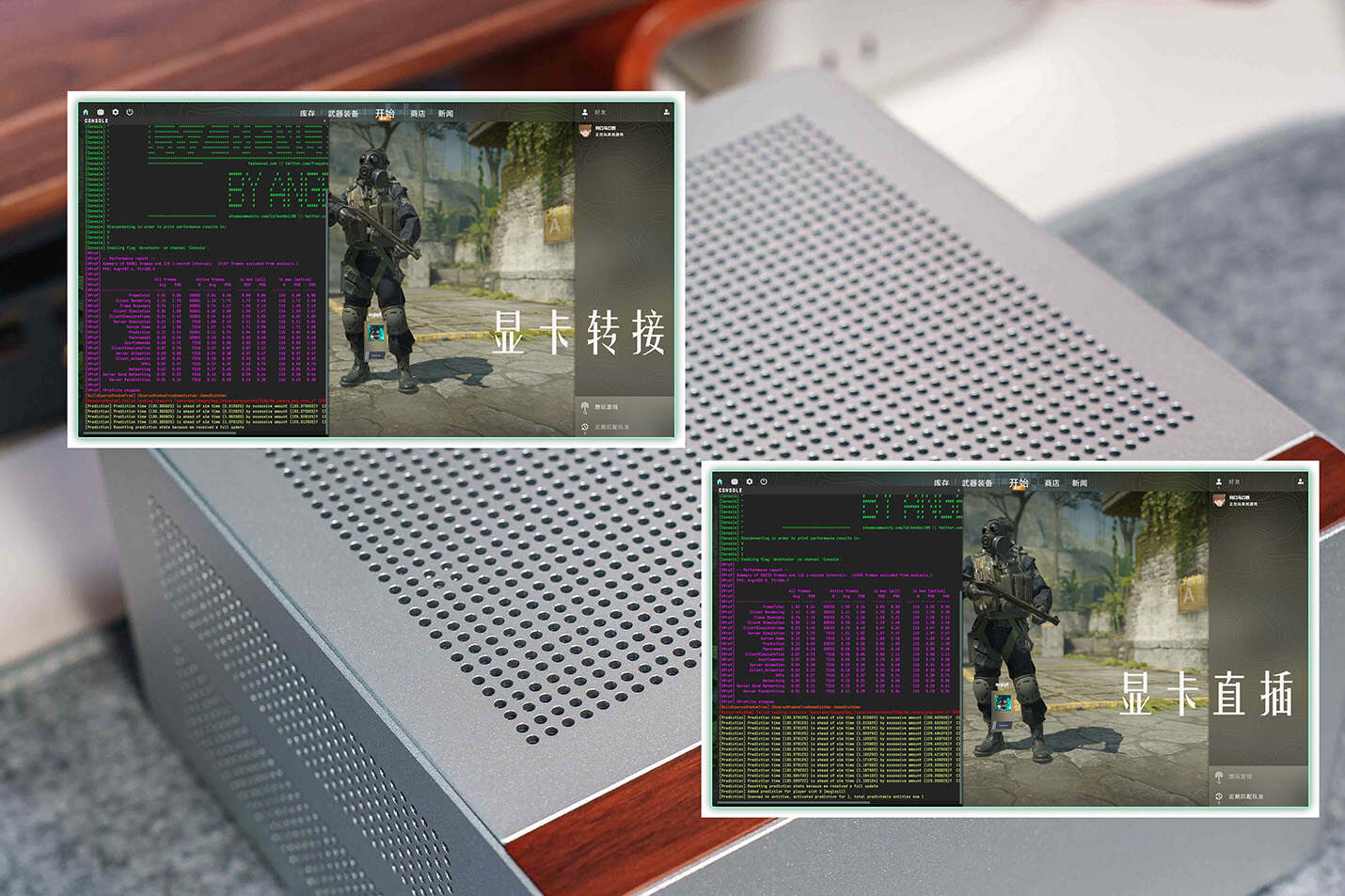 ▼网游 CS2 在 1080P 低画质下,平均帧(497FPS) ,P1(180FPS),对比显卡直插降幅比较明显了(526 / 195)。