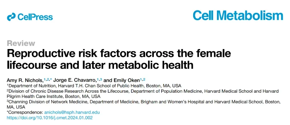 NICHOLS AR, CHAVARRO JE, OKEN E. Reproductive risk factors across the female lifecourse and later metabolic health. Cell Metab. 2024 Feb 6;36(2):240-262. doi: 10.1016/j.cmet.2024.01.002. Epub 2024 Jan 26. PMID: 38280383; PMCID: PMC10871592.