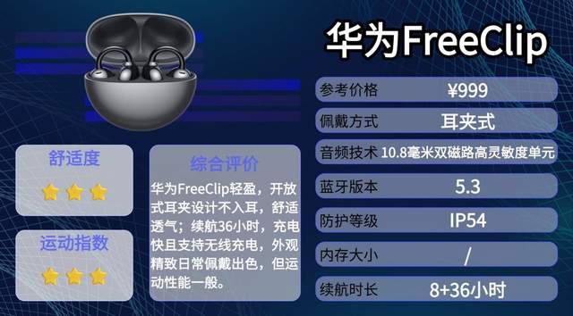 华为FreeClip是华为推出的一款开放式骨传导耳机,品牌背景可靠,设计精致小巧,偏向日常使用或轻运动场景。