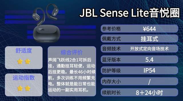 JBL Sense Lite音悦圈是JBL面向运动场景推出的开放式耳机,主打定向传声技术,精准把声音送入耳朵,同时支持IP54防水,适合跑步、健身等日常运动。