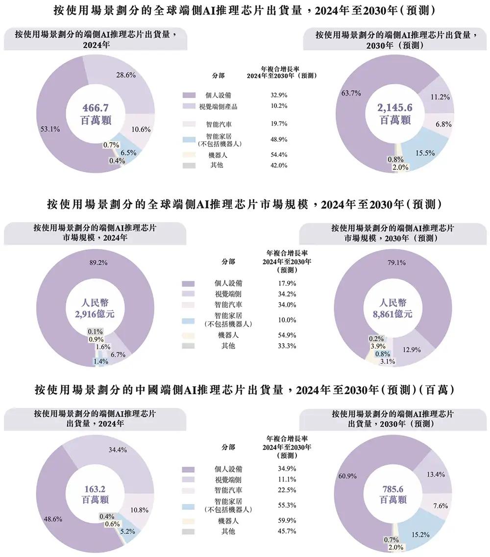 三、累计交付1.65亿颗芯片,智能汽车年收入涨超251%根据招股书,端侧AI推理芯片的应用场景涵盖个人设备、智能汽车、信息系统等领域,这些细分市场预计到2030年将在全球市场实现54.4%、48.9%及19.7%的出货量年复合增长率,在中国市场有望以更高增速发展,分别达到59.9%、55.3%、22.5%。