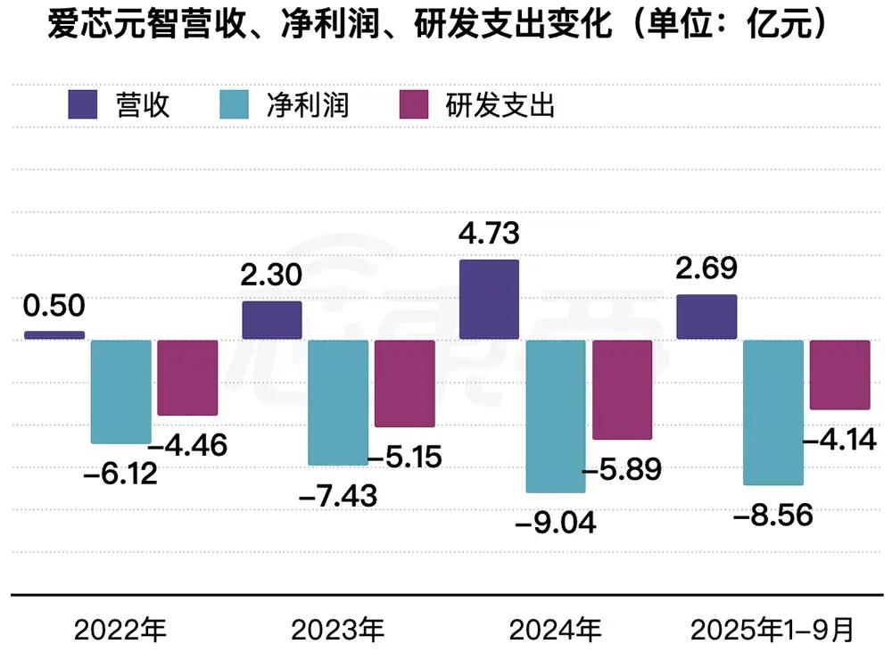 一、2024年收入翻倍,净亏损9亿元2022年、2023年、2024年、2025年1-9月,爱芯元智收入分别为0.50亿元、2.30亿元、4.73亿元、2.69亿元,净利润分别为-6.12亿元、-7.43亿元、-9.04亿元、-8.56亿元,研发费用分别为4.46亿元、5.15亿元、5.89亿元、4.14亿元。