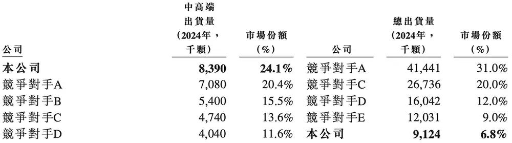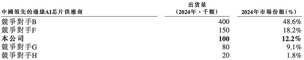 根据灼识咨询的数据,按2024年出货量计,爱芯元智是全球第一大中高端视觉端侧AI推理芯片提供商(市占率为24.1%)、全球第五大视觉端侧AI推理芯片提供商(市占率为6.8%)、中国第二大国产智能驾驶SoC供应商(售出超过51.8万颗智能汽车SoC)、中国第三大边缘AI推理芯片供应商(市占率为12.2%)。