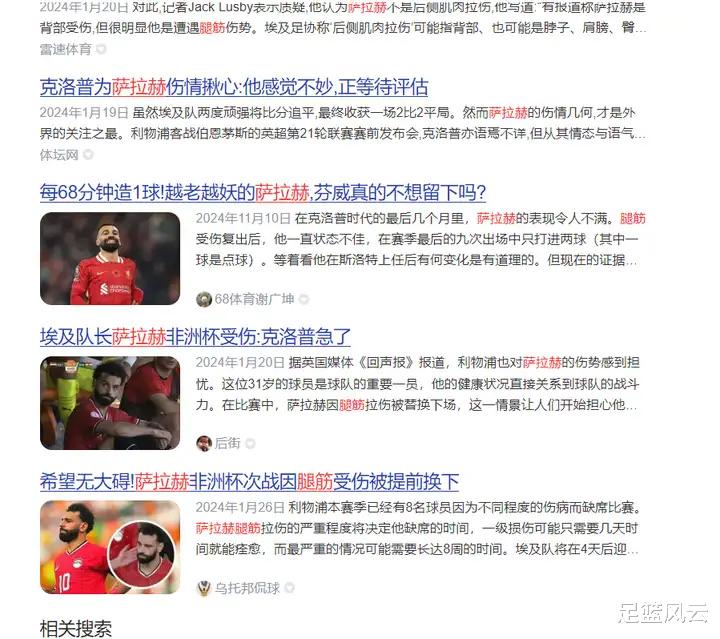 我回顾了一下萨拉赫的伤病史,这两年他的伤病频率比年轻时有所增加,基本上每隔2-3个月身体就要犯点小毛病,很多时候也有带着轻伤上阵的情况。