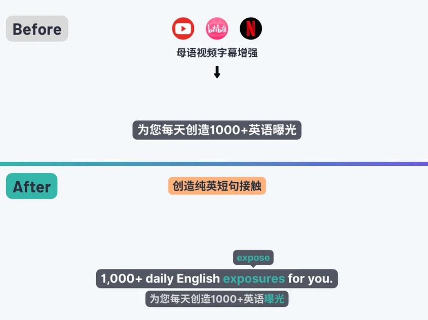 比如你刷知乎、看微博、刷 B 站时,页面里的部分词汇、短语,会被自动替换成英文,并附上注解。