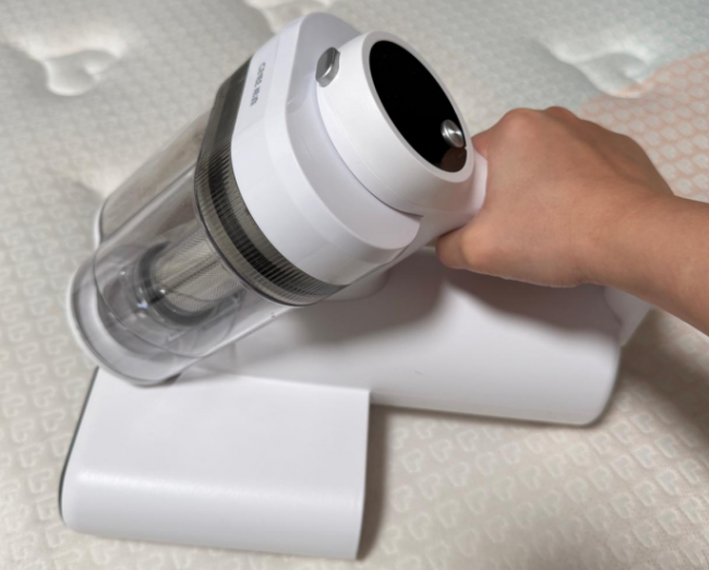 ▶ 使用体验:我家在南方,潮湿天多,这款除螨仪的烘干和杀菌效果真的戳我。不管是床垫、沙发还是地毯,深层的螨虫和排泄物都能被彻底震落吸净,不用反复清洁。5颗UV-C灯珠杀菌率100%,比传统机型效果好太多,家里有敏感肌家人,用着特别安心。65℃热风穿透力强,清洁完床品干爽不返潮,能从源头抑制螨虫再生。AI尘螨感应很实用,机身屏幕能实时显示尘螨数量,清洁效果一目了然,顺滑滚轮推拉不费力,长时间清洁也不累手,拆洗组件也很方便。