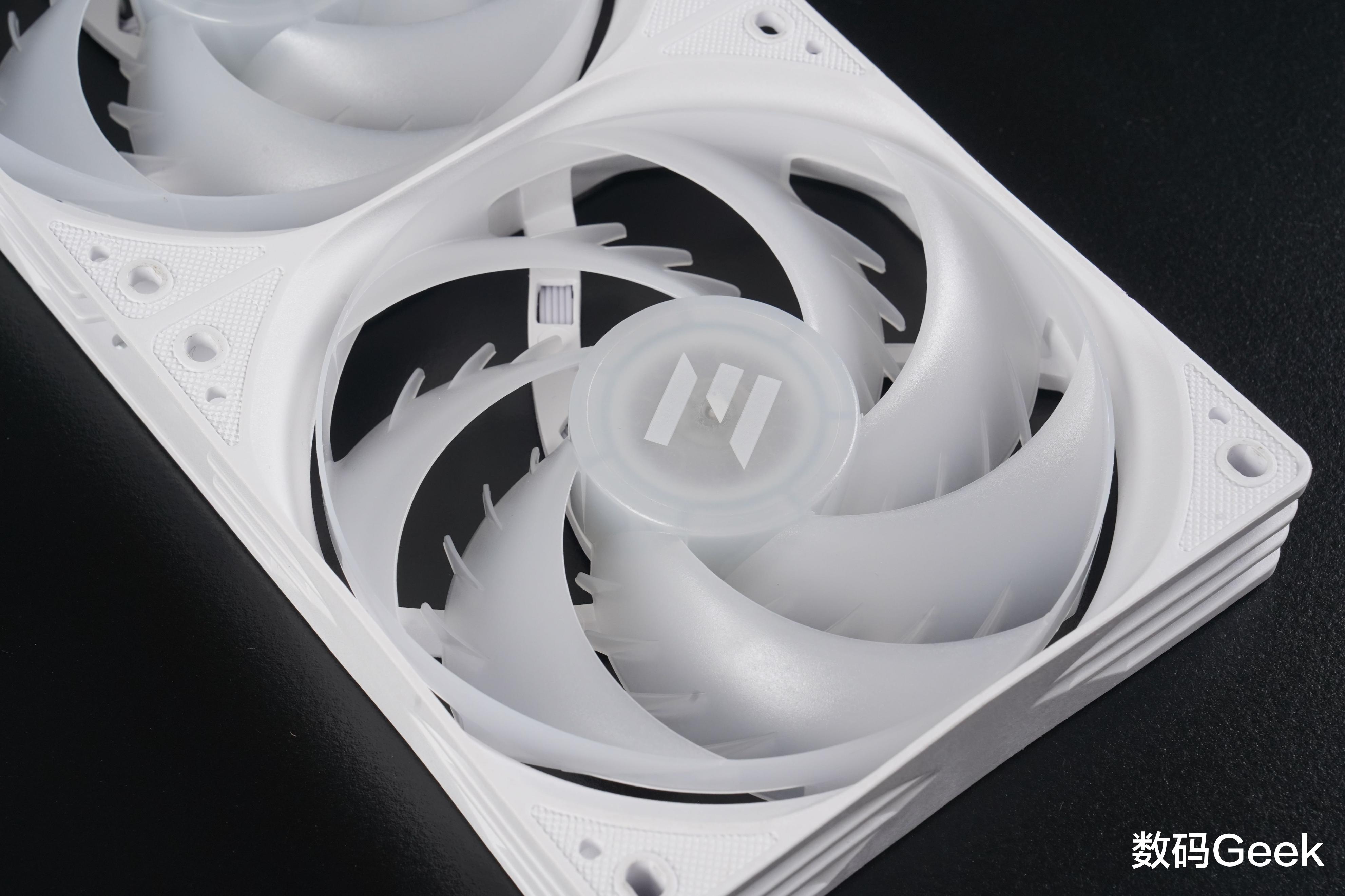 散热器配备三把120mm 创新鲨鱼能力片风扇。扇叶设计借鉴空气动力学原理,在叶片边缘加入了类似鲨鱼鳍状的扰流结构。这种设计能有效梳理气流,减少叶片尖端产生的涡流和空气湍流,从而在相同转速下带来更大的风压和风量,同时显著降低噪音。风扇采用“三台一体”的单框联动设计,简化了安装步骤,并形成了统一的定向导流风道,提升散热效率。可拆卸的扇叶侧面面板也便于用户日常清灰维护。