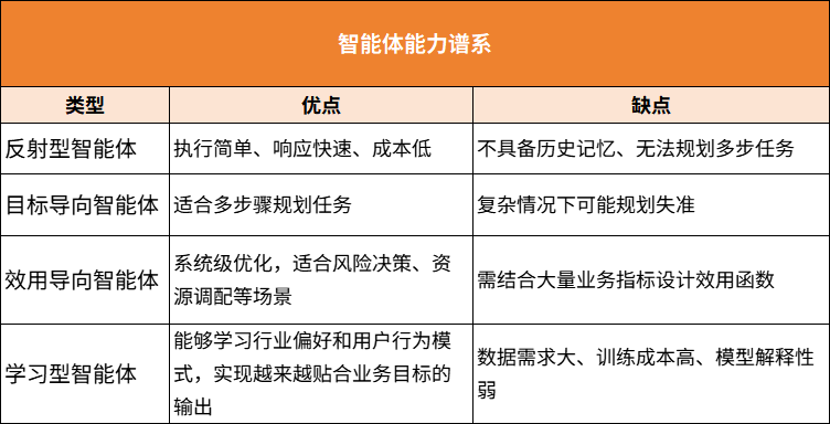 需要特别说明的是,大多数企业初期应用并不需要直接进入学习型阶段,即便是金融风控模型,也通常从“效用导向+规划执行”开始,而非从自学习上线。