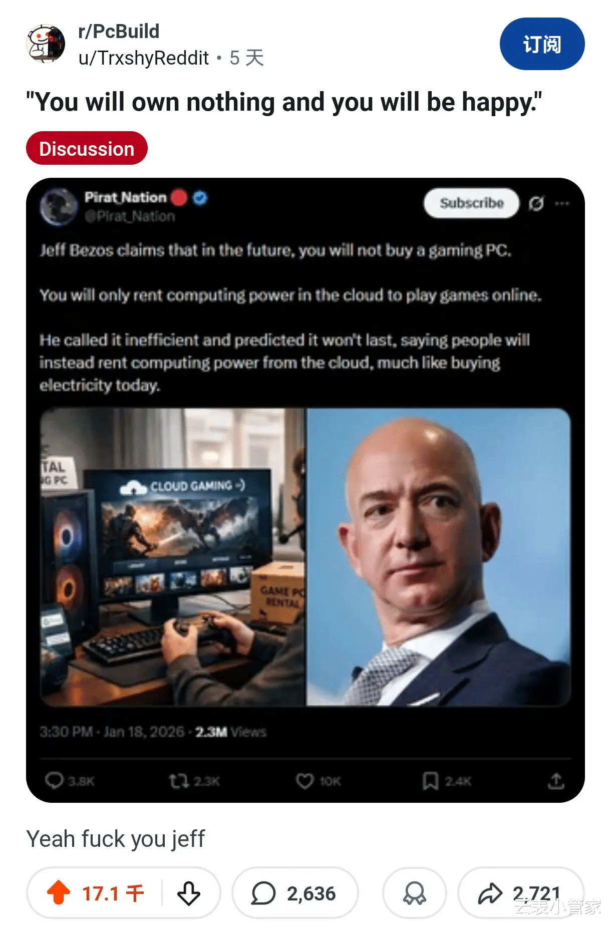 亚马逊创始人贝佐斯一句预言,最近掀了热议:未来大家不用买电脑,办公、打游戏全靠租用云端就行,电脑迟早被淘汰。