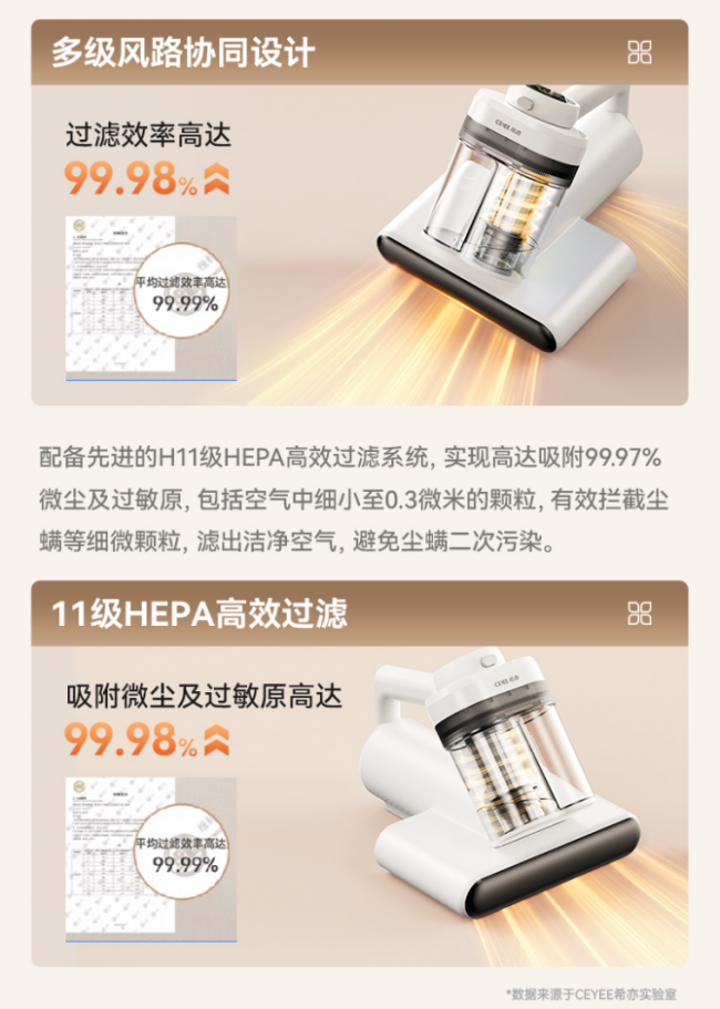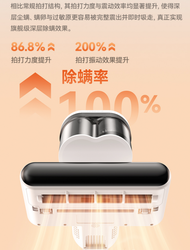 1、HVTOP Pro双擎除螨系统,拍吸协同实现深层清除希亦V1搭载自研 HVTOP Pro双擎除螨系统,通过高频强拍打与高负压吸附协同工作,实现“先震出、再吸走”的深层清洁逻辑,整机除螨速度提升93.5%。高速拍打结构能够有效削弱尘螨在织物纤维中的附着力,使深层螨虫、皮屑与过敏原被整体震出,并由强吸力迅速带走。相比传统依靠单一吸力的方案,整机过滤效率高达99.99%!拍打与吸附协同效率更高,深层除螨表现更接近旗舰级清洁标准。